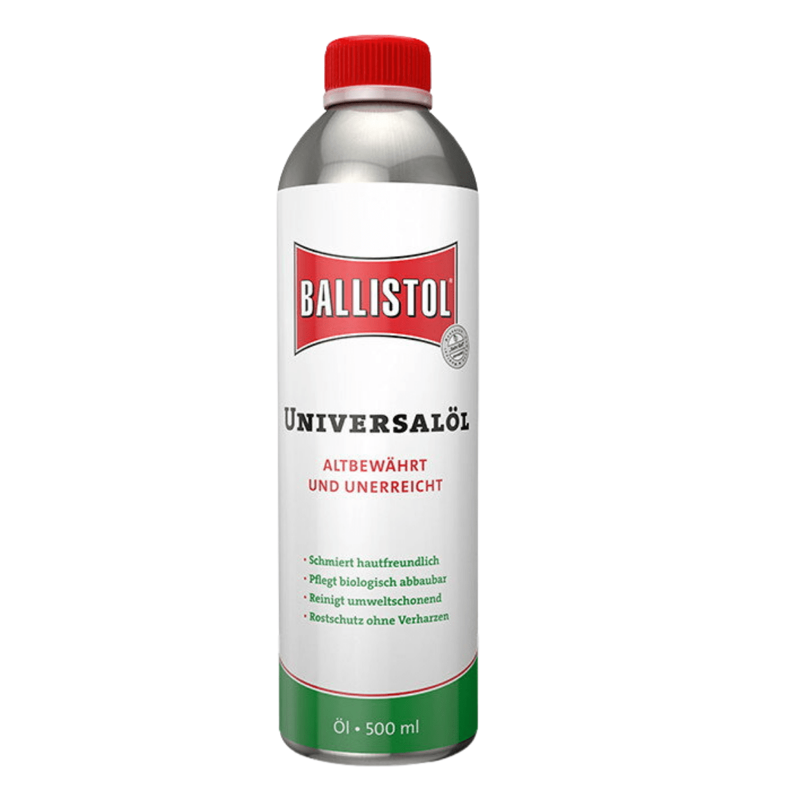 Ballistol Universal Oil 500 ml do pielęgnacji materiałów naturalnych, takich jak drewno, skóra oraz stal nożowa.