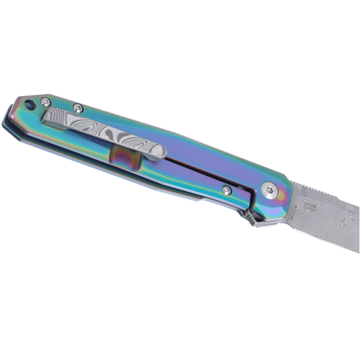 Lekka rękojeść z tytanu posiada powłokę z tytanowego azotku, nadając jej unikalny, iryzujący wygląd, a dołączony tęczowy brelok i koralik pozwalają na personalizację. Niskoprofilowy deep carry damascus clip umożliwia dyskretne noszenie w kieszeni.