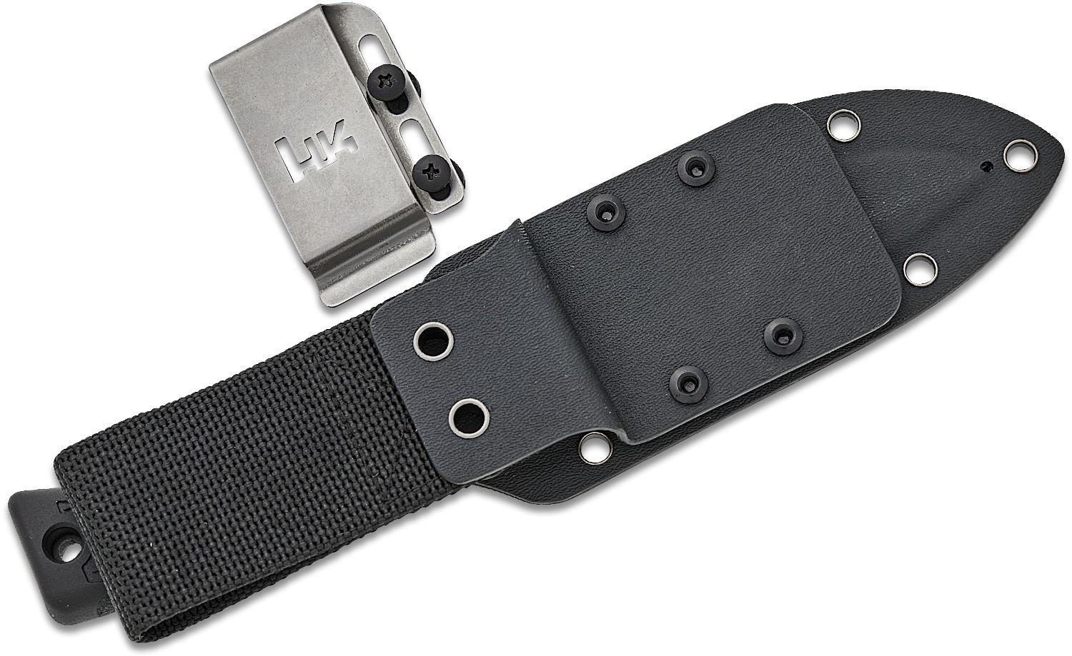 Dodatek manganu i azotu (mangan zwiększa rozpuszczalność azotu w matrycy) nadaje tej stali wysoką twardość, trwałość krawędzi i odporność na korozję przy drobnej mikrostrukturze. Zwiększa to odporność na wstrząsy i złamania oraz możliwość ponownego ostrzenia. Tang rozciąga się całkowicie przez rękojeść, co widać w otworze na smycz. Jednak nie jest on odsłonięty na końcu, dzięki czemu można wywierać nacisk lub lekko uderzyć piętą dłoni w ten obszar. Jednoczęściowa rękojeść jest wykonana z niezniszczalnego nylonu wzmacnianego włóknem szklanym (FRN). Dla HK MP7 PDK opracowano modułowy system noszenia oparty na pochwie Kydex, aby sprostać wszystkim sytuacjom zastosowania. Nóż siedzi głęboko i bezpiecznie w precyzyjnie dopasowanym uchwycie, więc dodatkowe zapięcie nie było wymagane. Można dołączyć albo solidną nylonową pętlę na pasek, albo stalowy klips kompatybilny z molle.