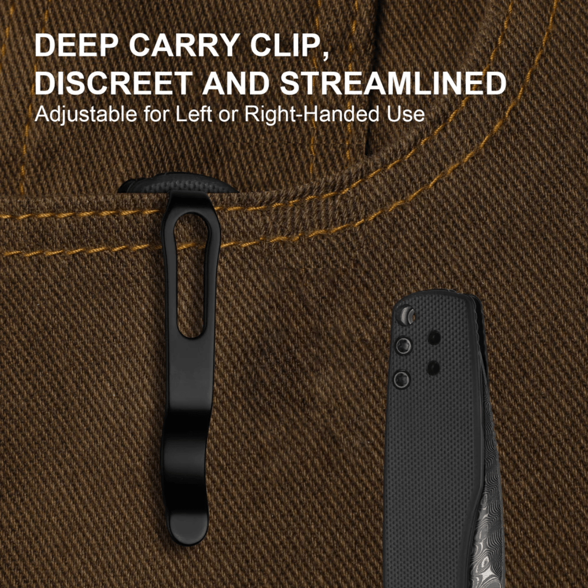 Głownia typu Drop Point z gładkim ostrzem i pełnym płaskim szlifem wykonana jest z wysokiej jakości stali damasceńskiej o czarnym matowym wykończeniu. Ostrze to charakteryzuje się unikalnym wzorem pióra, który łączy efektowną estetykę z wyjątkową ostrością, trwałością krawędzi i odpornością na korozję. Otwieranie jedną ręką jest bardzo łatwe dzięki thumb stud. Wyposażony w clutch-lock, zapewnia bezpieczne blokowanie i łatwość obsługi, co sprawia, że jest prosty w użyciu. Dodatkowo, jego szybkie działanie czyni go szczególnie przyjaznym dla początkujących.