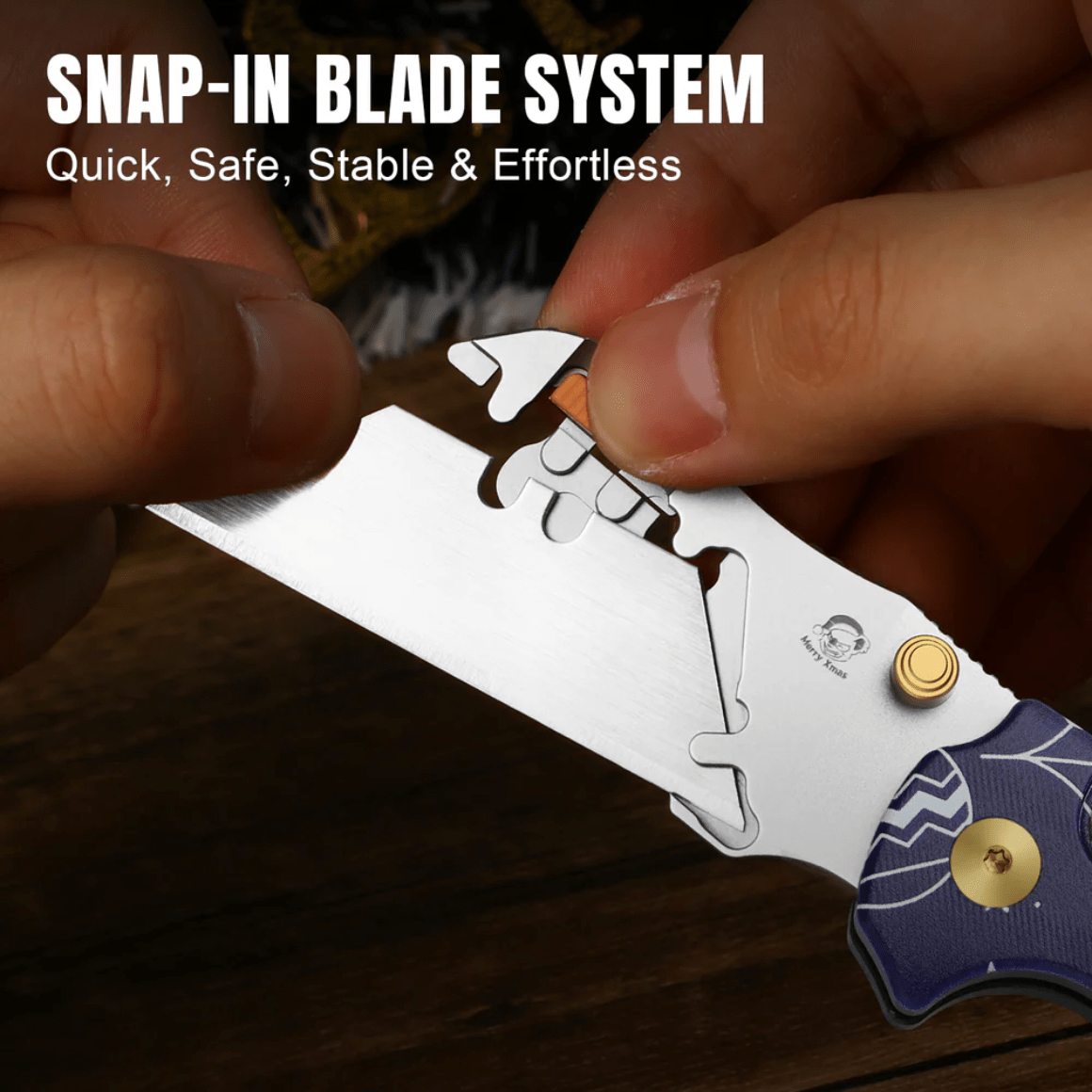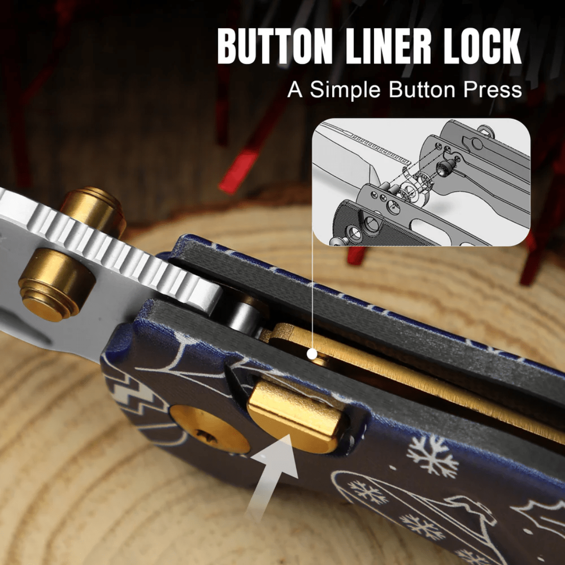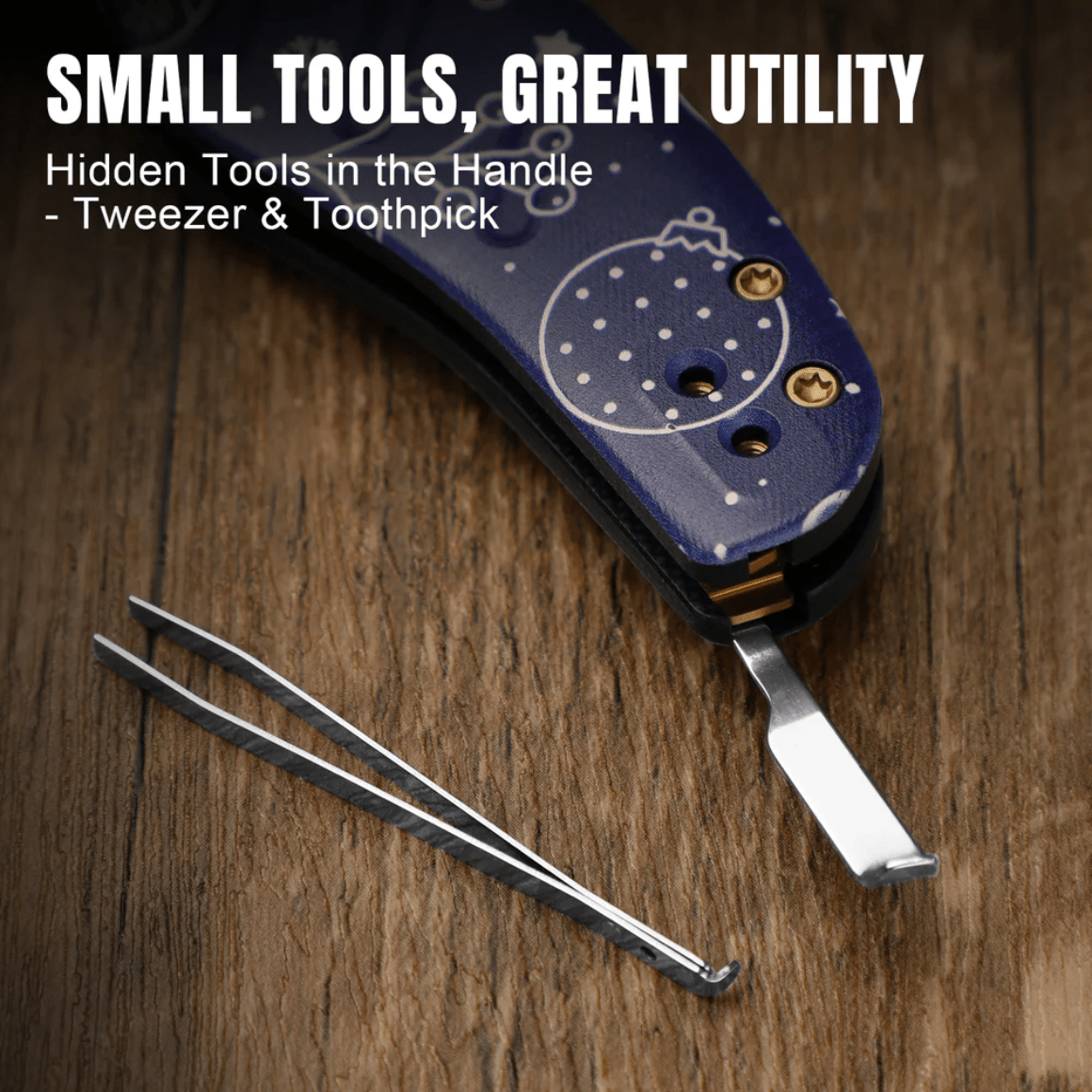 Rękojeść wykonana jest z materiału kompozytowego G10 w kolorze niebieskim z błyszczącymi świątecznymi ozdobami. Ergonomiczne bezpieczeństwo dzięki uchwytowi na cztery palce i profilowanemu kształtowi. W rękojeści ukryte są narzędzia - pęseta i wykałaczka.
