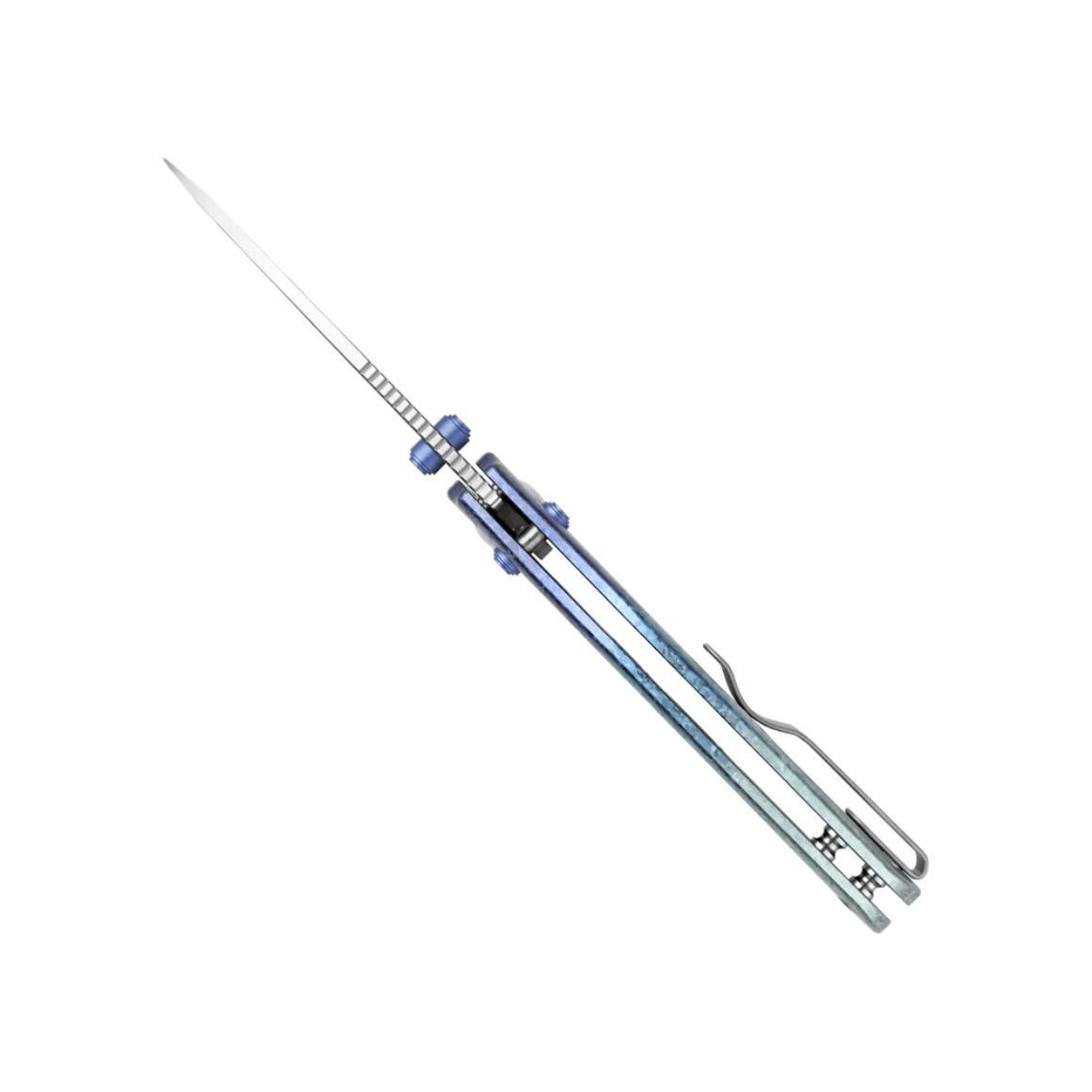 Rękojeść wykonana jest z krystalizowanego niebieskiego tytanu z unikalnymi wzorami kryształów o iryzującym efekcie. Z połyskującym, matowym wykończeniem, które jest zarówno luksusowe, jak i wytrzymałe, stanowi idealne dopasowanie do świątecznego motywu. Ergonomiczna kontrola bezpieczeństwa dzięki uchwytowi na cztery palce i profilowanemu designowi.