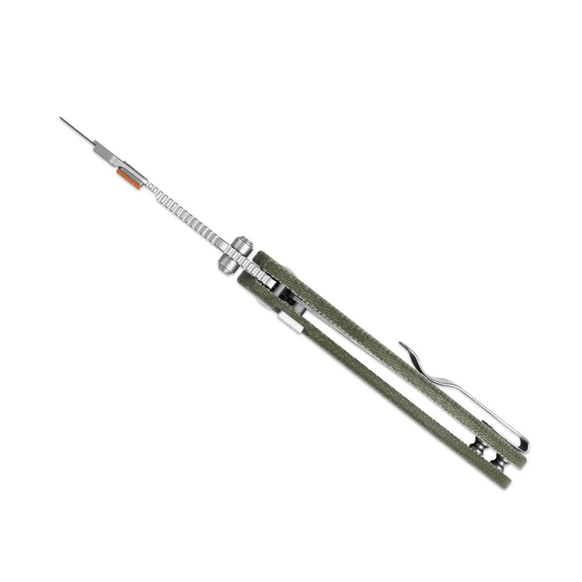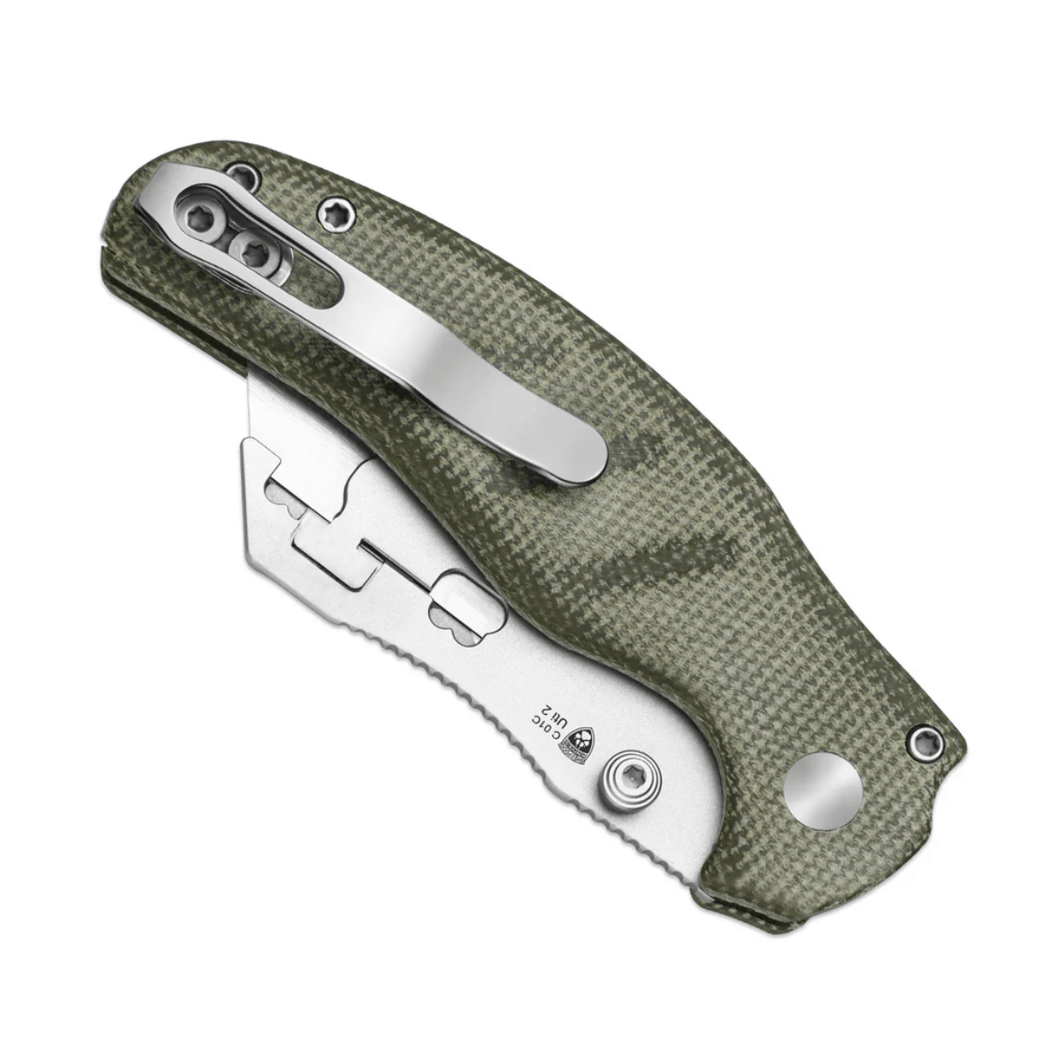 Rękojeść wykonana jest z zielonej Micarty z ergonomiczną kontrolą bezpieczeństwa dzięki uchwytowi na cztery palce i profilowanemu designowi. W rękojeści ukryte są narzędzia - pęseta i wykałaczka.