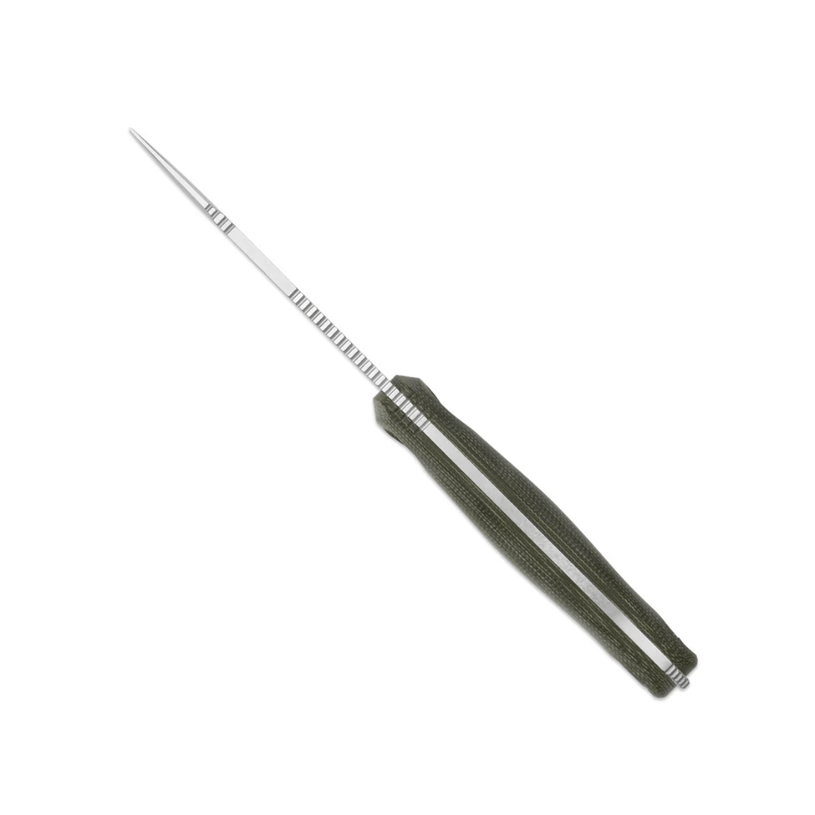 Rękojeść wykonana z zielonej Micarty z szkieletowym tangiem zapewnia stabilny, pewny chwyt i umożliwia uchwyt na cztery palce.