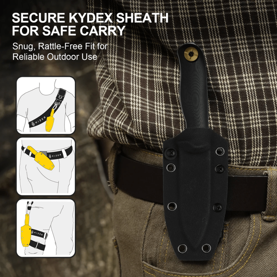 W zestawie znajduje się regulowana pochwa Kydex, która zapewnia bezpieczne noszenie, trzymając nóż pewnie i bez luzów, umożliwiając dostosowanie napięcia dla bezpiecznego i niezawodnego noszenia podczas aktywności na świeżym powietrzu.