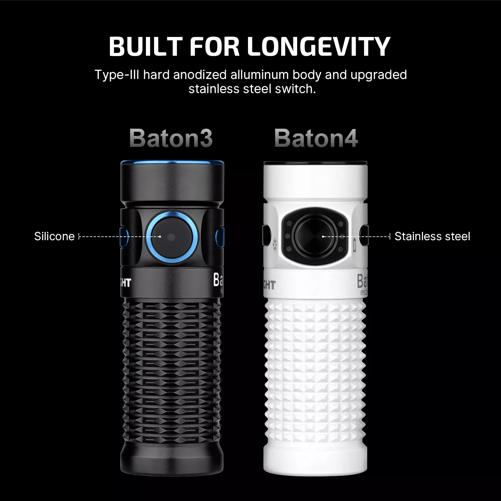 Baton 4 Premium Edition oferuje pięć poziomów jasności oraz stroboskop. Latarka włącza się i wyłącza jednym naciśnięciem bocznego przycisku. Wybierz poziom jasności, gdy latarka jest włączona, przytrzymując przełącznik, przechodząc przez poziomy niski, średni i wysoki. Tryb moonlight o jasności 0,5 lumena można aktywować bezpośrednio, gdy latarka jest wyłączona, przytrzymując przełącznik. Tryb turbo aktywuje się szybkim podwójnym naciśnięciem, a tryb stroboskopowy trzema szybkimi naciśnięciami. Funkcja pamięci zapamiętuje ostatnio używany tryb dla moonlight, niskiego, średniego i wysokiego poziomu. Lewy wskaźnik pokazuje aktualny poziom jasności podczas używania latarki.
