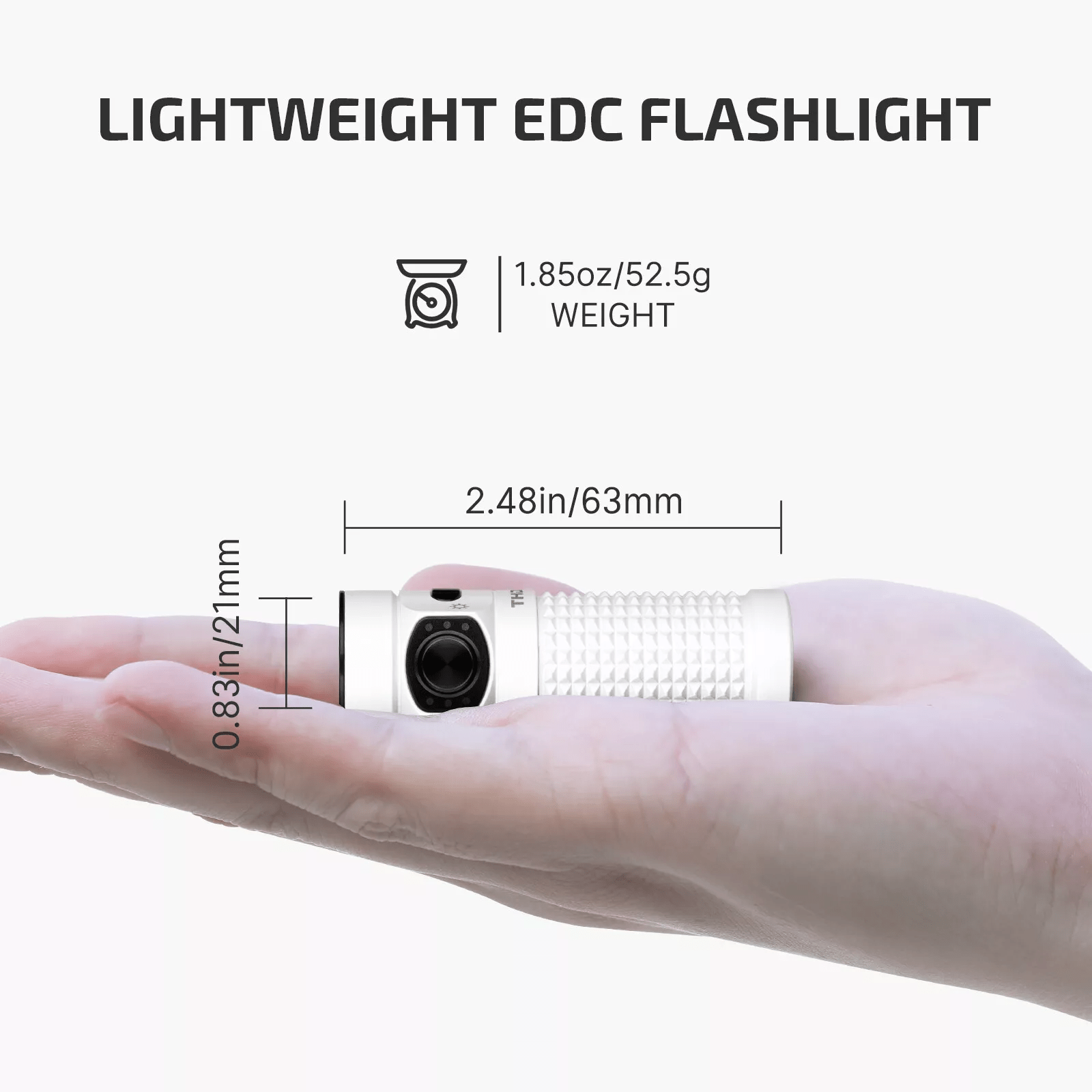 Wymiary: Latarka: 2,48 x 0,83 x 0,83 cala (63 x 21 x 21 mm); Etui ładujące: 2,56 x 1,26 x 3,46 cala (65 x 32 x 88 mm)