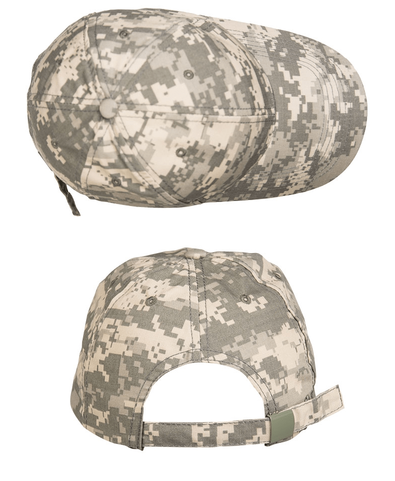 Klasyczna czapka baseballowa Mil-TEC BASEBALL CAP w kamuflażowym kolorze AT-DIGITAL z 65% poliestru i 35% bawełny z technologią Ripstop. Z małymi otworami wentylacyjnymi wokół głowy, z regulowanym rozmiarem za pomocą rzepa. Uniwersalny rozmiar.