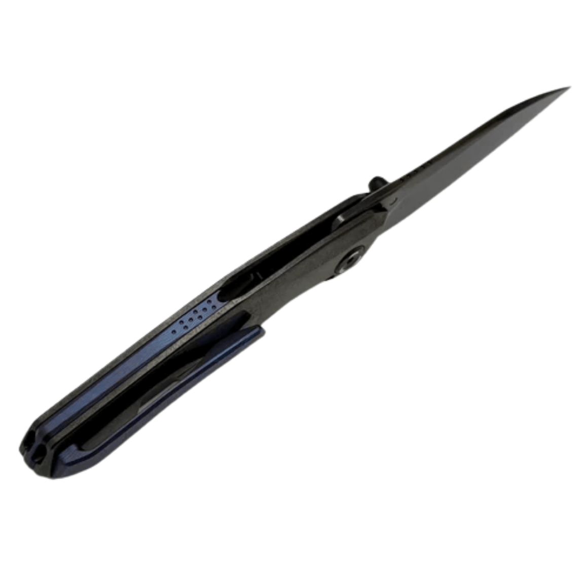 Rękojeść wykonana z czernionego tytanu kryształowego z niebieskimi akcentami, co zapewnia zarówno wytrzymałość, jak i atrakcyjne wizualnie wykończenie. Tip-down pocket clip umożliwia dyskretne i bezpieczne noszenie.