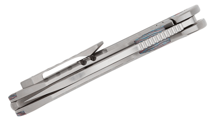 Rękojeść wykonana jest z lekkiego tytanu z wykończeniem bead blasted oraz wkładkami z red-white-blue carbon fiber. To połączenie nie tylko zmniejsza całkowitą wagę noża, ale także dodaje mu elegancji i wyrafinowania. Dzięki tytanowemu klipsowi do kieszeni, nóż jest łatwy do przenoszenia. Przeznaczony jest dla użytkowników praworęcznych!