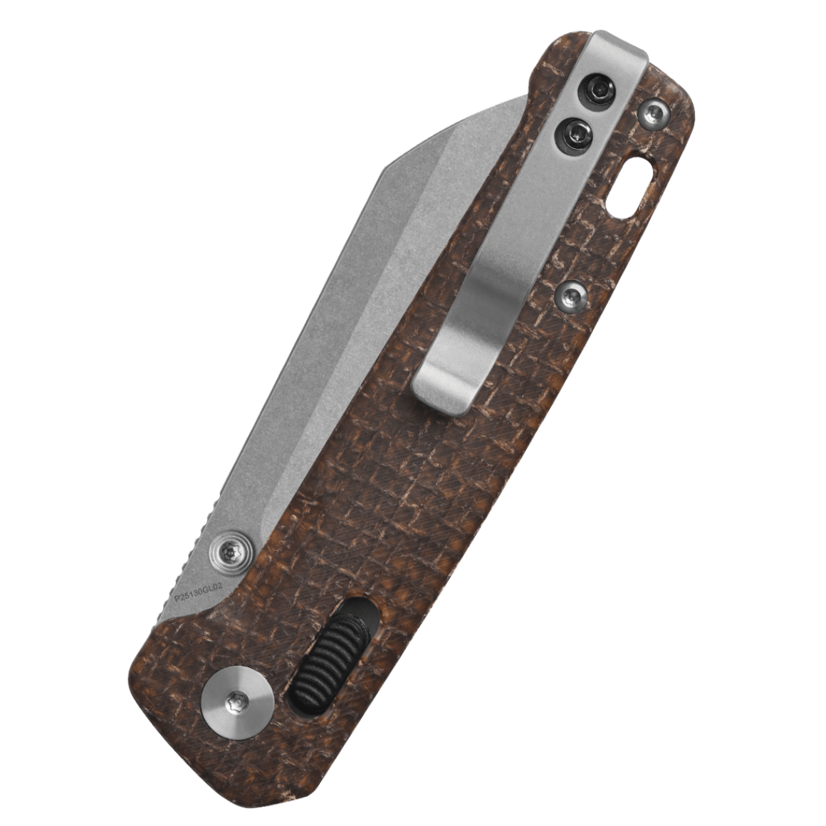 Rękojeść wykonana jest z brązowego burlap Micarta i posiada stalowe wkładki dla dodatkowej wytrzymałości. Micarta to materiał kompozytowy złożony z lnu i żywicy syntetycznej. Jest niezwykle trwały, lekki i doskonale leży w dłoni. Wyposażony w odwracalny deep carry clip do kieszeni.
