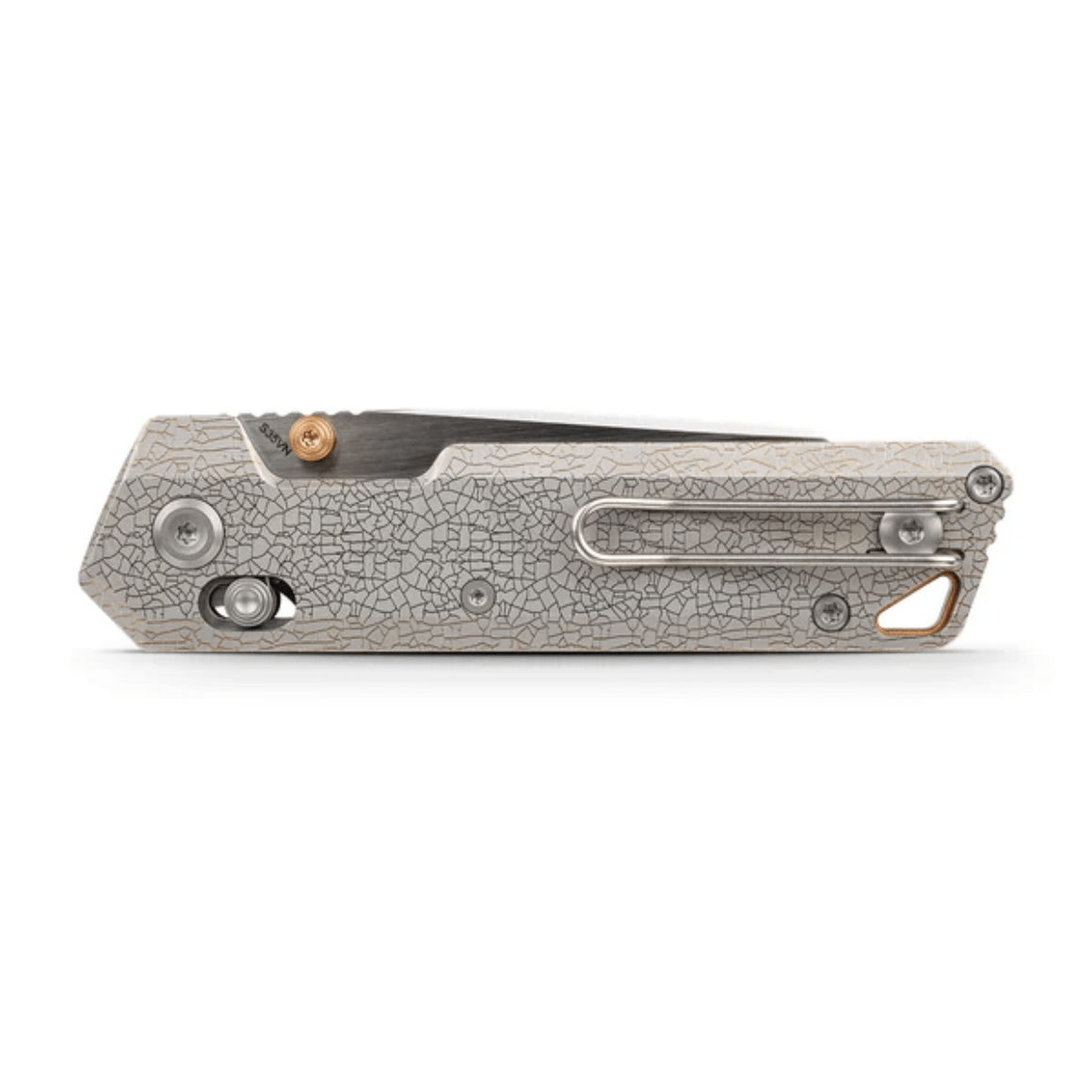 Rękojeść wykonana jest z tytanu Arctic Crackle, prezentując wyrafinowaną srebrną powierzchnię z grawerowanymi złotymi wzorami pęknięć, uzyskanymi zaawansowanym procesem laserowym. W przeciwieństwie do wykończeń opartych na zmianie koloru, Arctic Crackle osiąga swoją głębię i charakter wyłącznie dzięki precyzyjnemu grawerowaniu laserowemu. Grawerowana tekstura łapie i odbija światło pod różnymi kątami, nadając rękojeści subtelną, zmieniającą się obecność, jednocześnie zachowując spójny wzór na całej powierzchni.