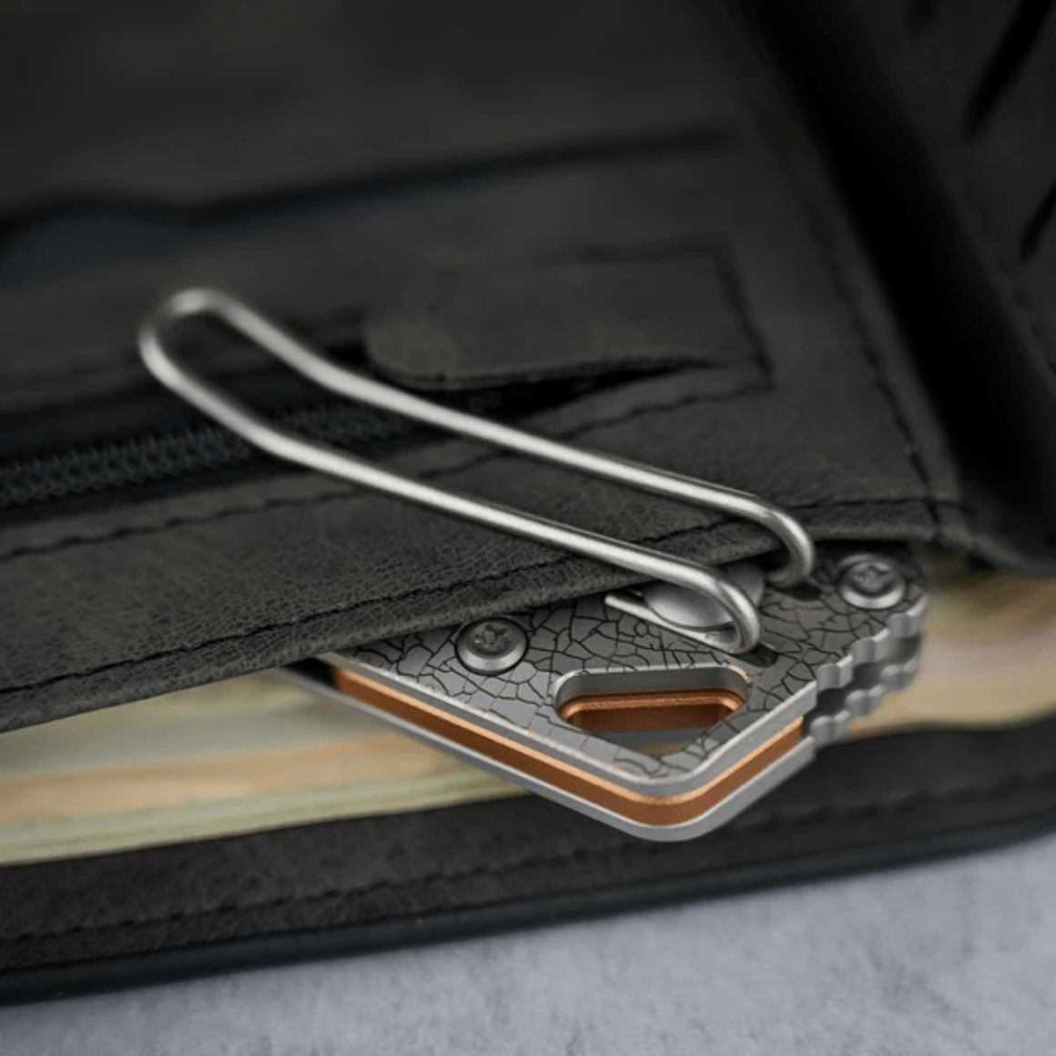 Czysty, trójkątny otwór na smycz dodaje praktyczności i stylu, ucieleśniając esencję zarówno funkcji, jak i elegancji. Z odwracalnym stalowym klipsem do kieszeni.