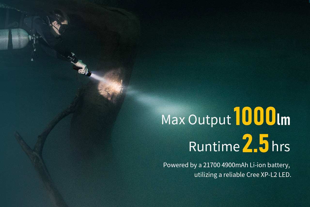 • Maksymalna moc 1000 lm, czas pracy 2,5 godziny